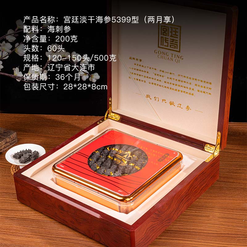 商品名称:宫廷传奇 淡干海参/宫廷5399型 两月享 60头/200克 含盐量小于等于18%