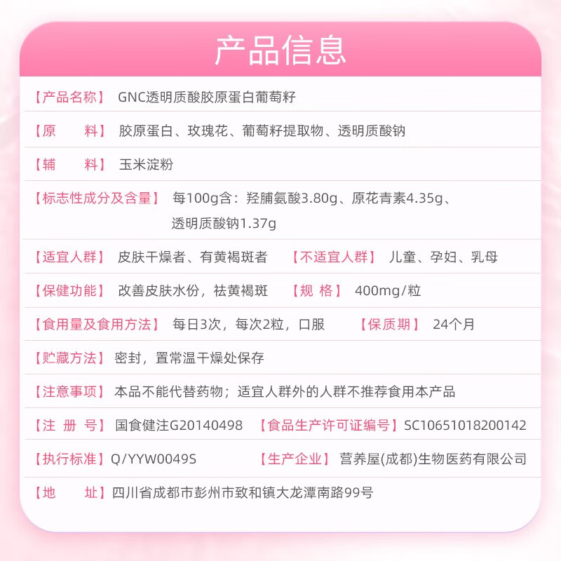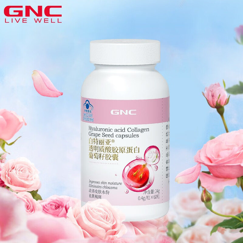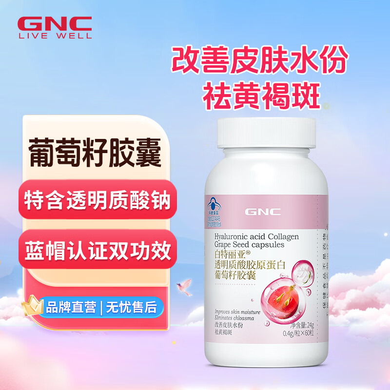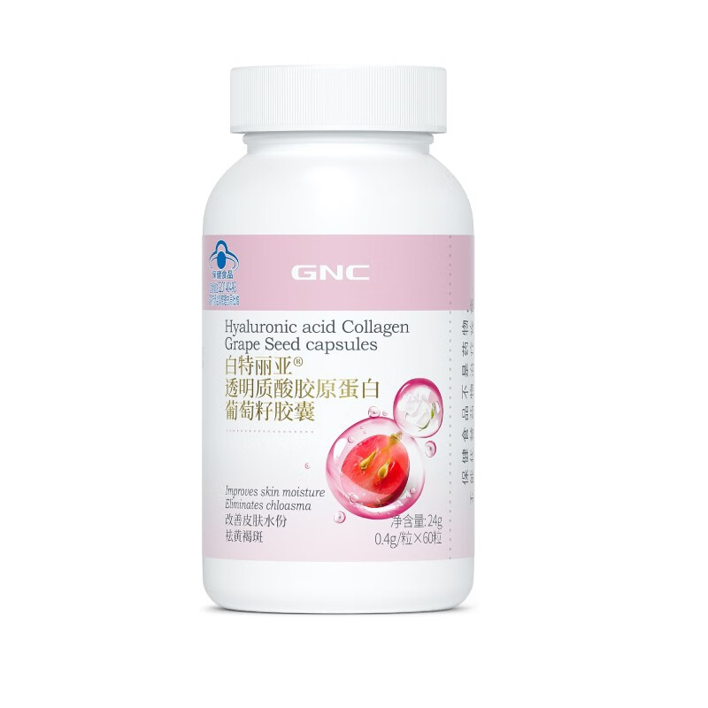 商品名称:GNC健安喜 祛黄褐斑+改善皮肤水份 透明质酸胶原蛋白葡萄籽胶囊60粒