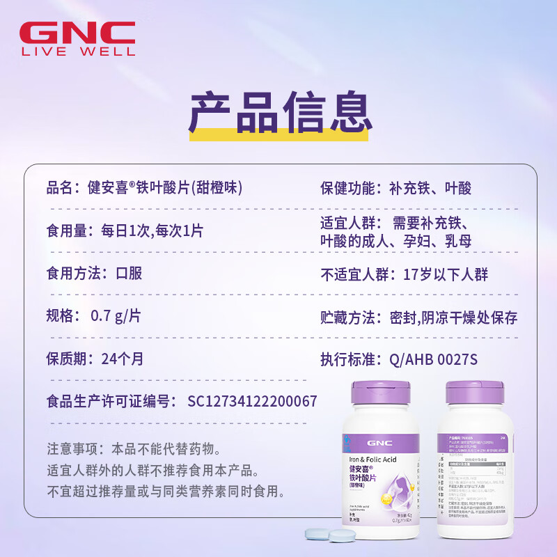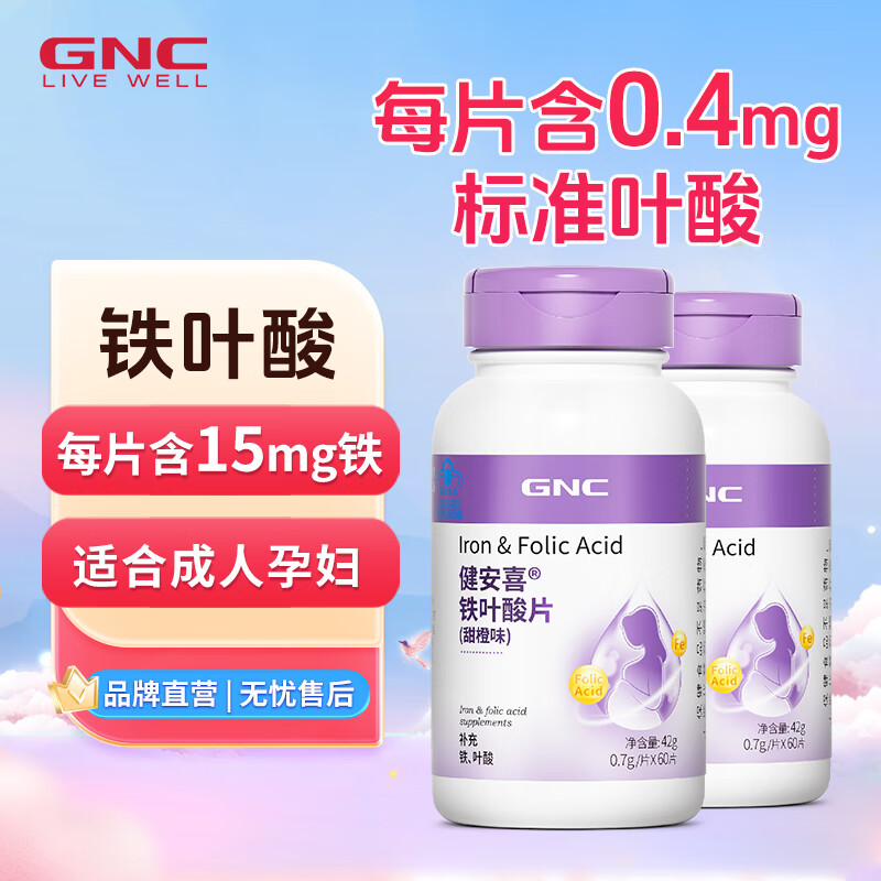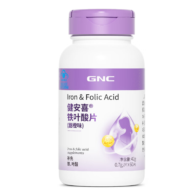商品名称:GNC健安喜 铁叶酸片60片(甜橙味)备孕 (成人、孕妇,非活性叶酸)