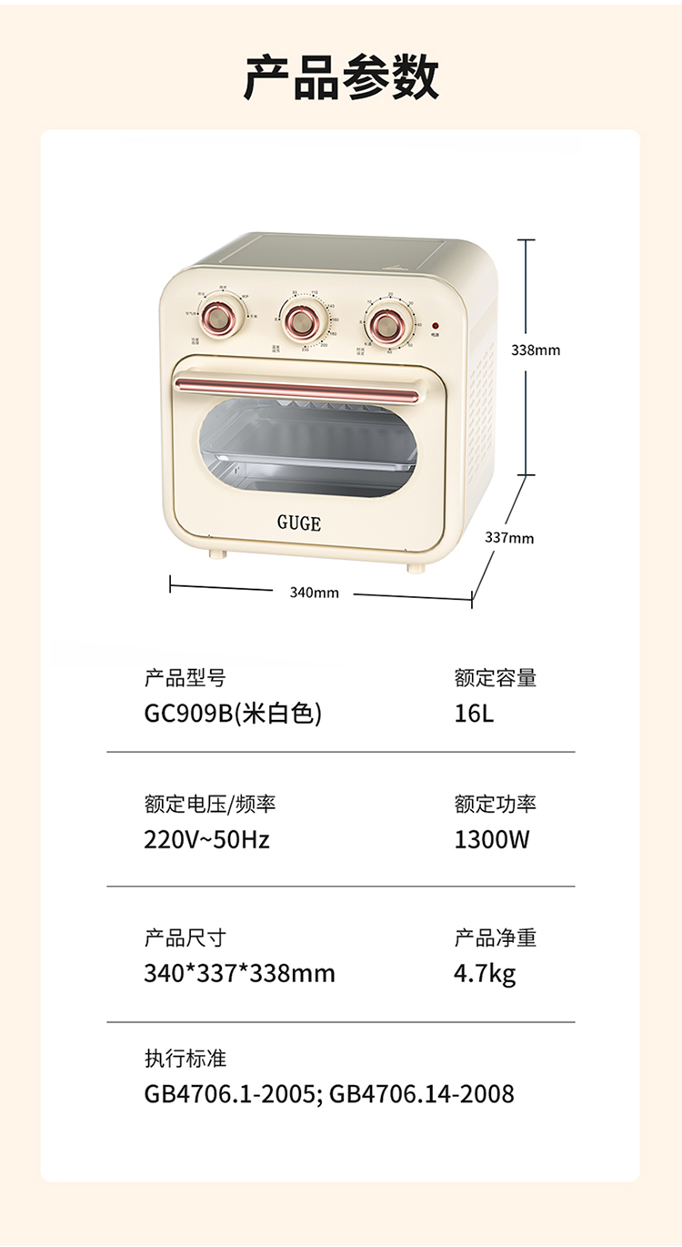 商品名称:谷格 (GUGE) 空气炸锅GC909B 额定容量:16L 健康空气炸,烤一体,配空气炸篮