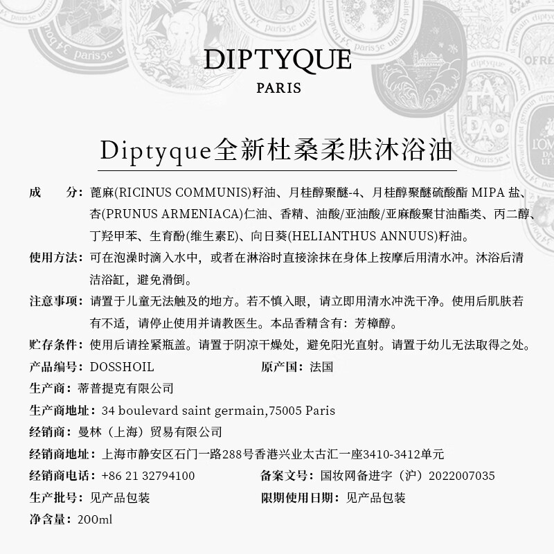 蒂普提克(Diptyque)杜桑柔肤沐浴油200ml 香氛香水 套装礼盒 生日礼物送女友